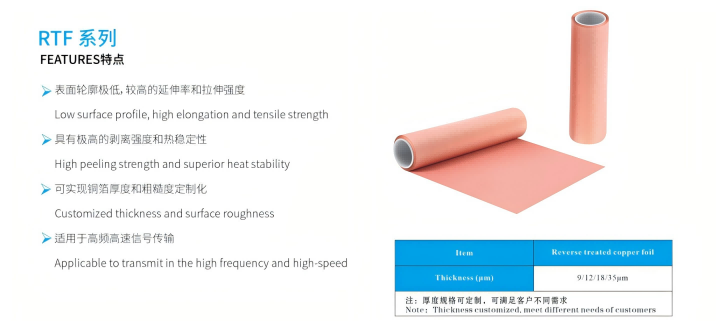 Reverse treated copper foil is an electrolytic copper foil produced by Guangzhou Fangbang Electronics Co.Ltd.It has low surface profile,high elongation and tensile strength,high peeling strength and superior heat stability.The company's current reverse treated copper foil specifications are mainly 9μm,12μm and 18μm.The copper foil have uniform thickness and fine micro-crystal structure,which can be widely used in HDI,FPC,PCB,CCL,FCCL and other fields.